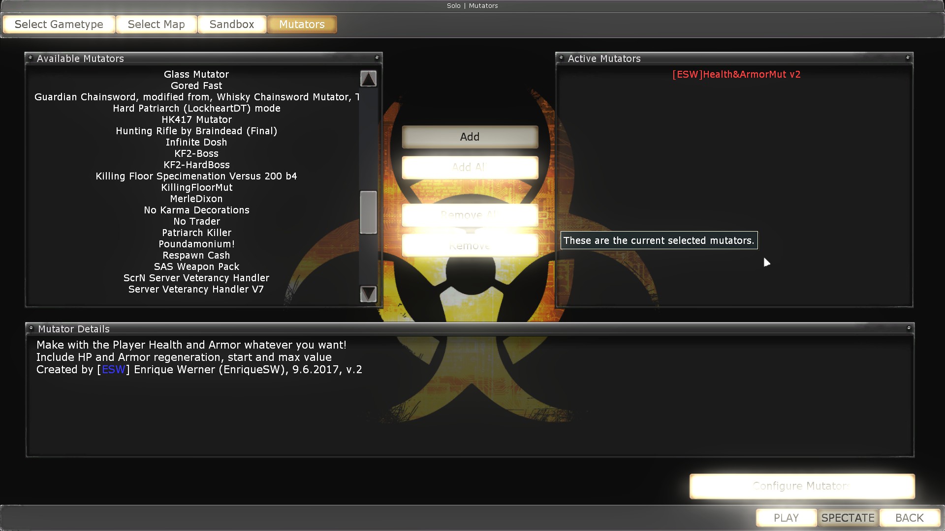 In the first killing floor you can easily add mutators from a mutator menu available when you re setting up your match.